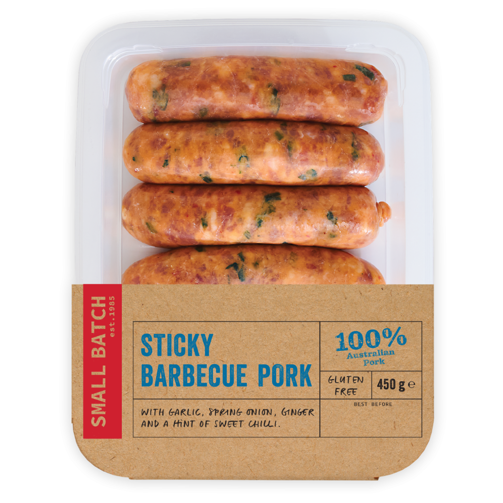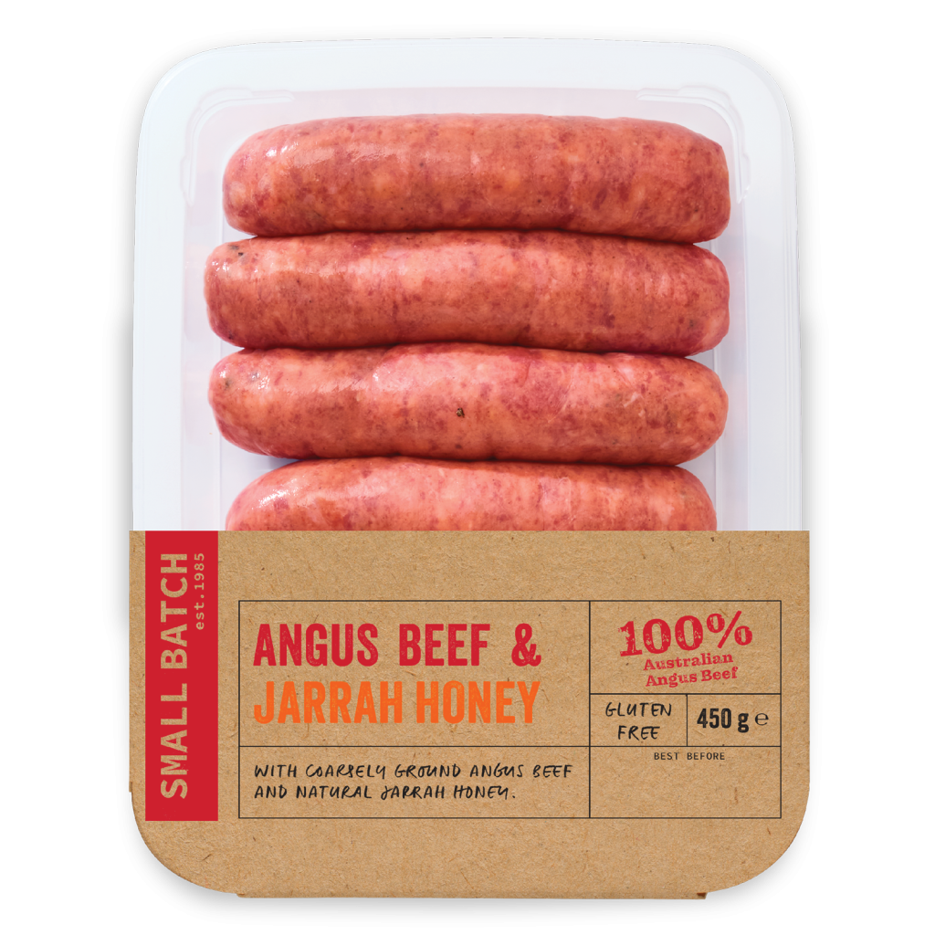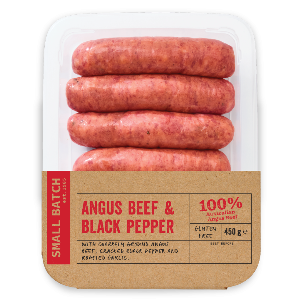 Our unique recipes are perfectly balanced, combining coarsely ground 100% Australian Angus Beef and 100% Australian Pork with a range of ingredients that are carefully chosen to highlight the distinct flavours of each protein. From Sticky BBQ Pork, to Angus Beef and Jarrah Honey, to Angus Beef & Black Pepper, all our Small Batch Premium Sausages are packed with flavour and all are gluten free.